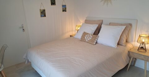 Vous disposerez de 70m² repartis : Rez de chaussée : donnant sur une terrasse avec pergola et table de jardin - pièce à vivre ouverte sur cuisine ouverte toute équipée - lingerie : avec toilette et machine à laver A l'étage : - 2 chambres : dressing, 2 lits de 80*190 ou 160*190 et une de 2 lits de 90*190 - salle d'eau : douche à l'italienne + double vasque+toilette Location linge de maison sur demande Place de parking